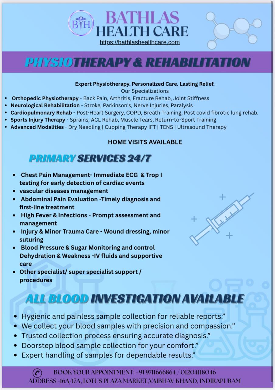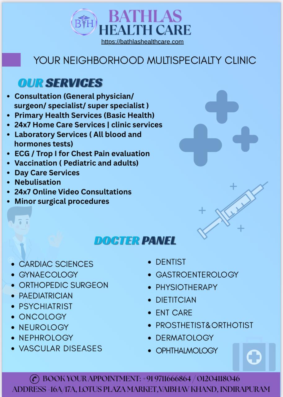 Whether you're looking for a general physician, general surgeon and vascular a veins specialist, a expert heart care, a good Neurologists, Nephrologist, ENT & Orthopedic Bathlas Health Care is dedicated to providing personalized and effective treatment to help you achieve optimal health. Visit us for trusted, top-quality medical care in Indirapuram.